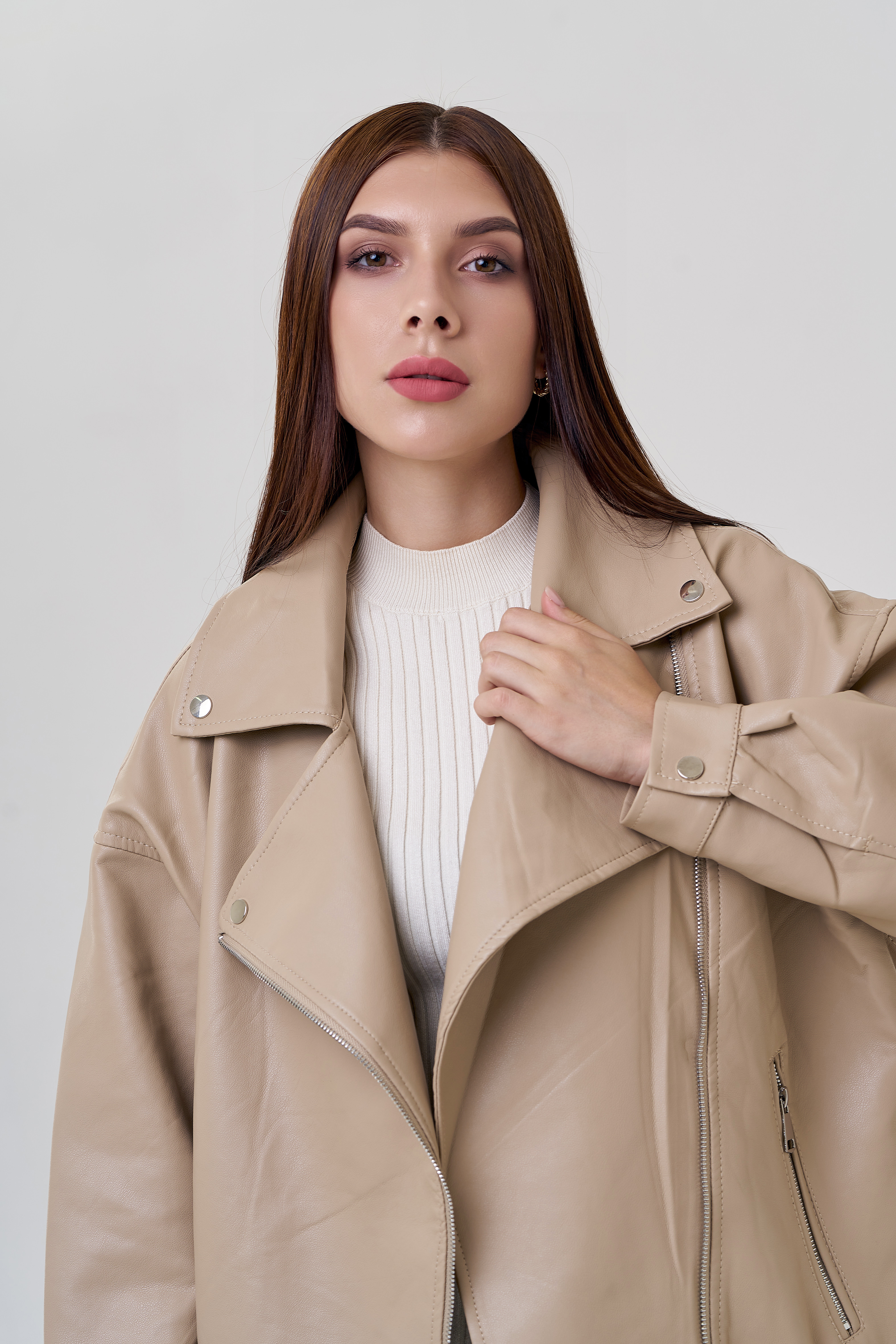 Бежевая куртка в стиле оверсайз точно попадет вам в сердце! Светло-бежевый цвет позволит подбирать к куртке разные образы. Материал эко кожи устойчив к холодам и повреждениям. Модель застегивается на молнию и кнопки. Имеется ремень и карманы на молнии. Рукава с манжетами на кнопках. Фасон оверсайз и спущенные плечи добавят комфорт.