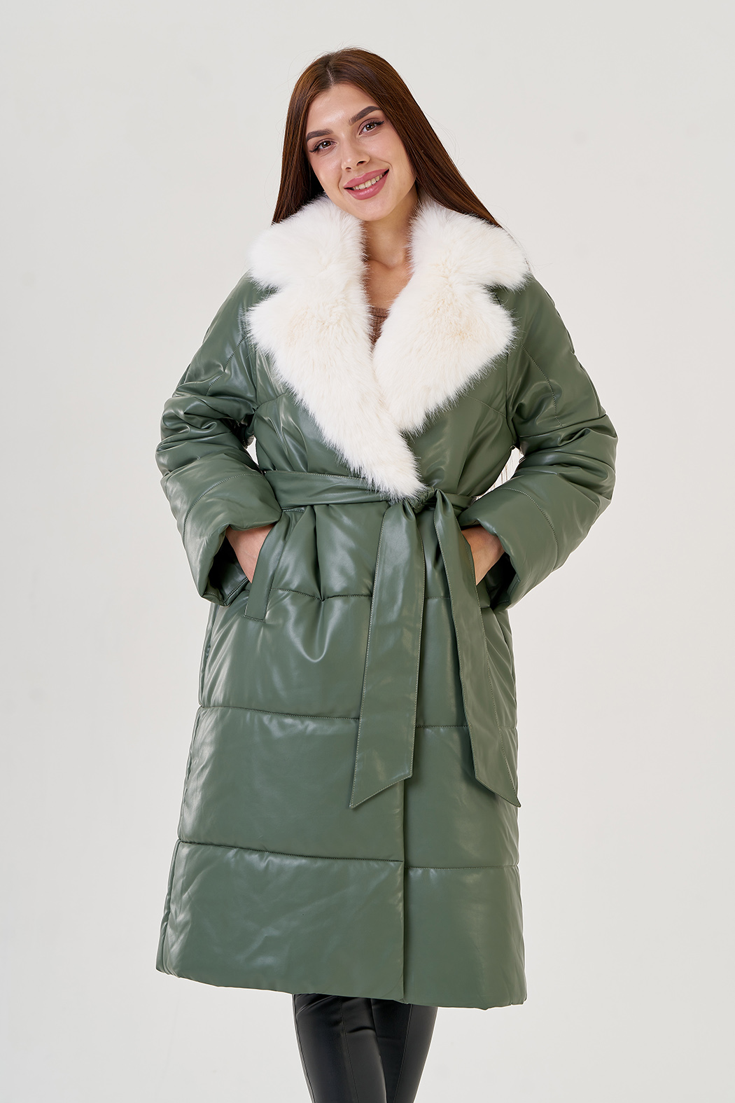 Пуховик в зеленом цвете с воротником из эко меха. Модель выполнена из эко кожи, что позволяет ей быть прочной и эластичной. Меховой воротник отстегивается. Английский ворот подчеркнет вашу шею. По бокам имеются прорезные карманы. В комплекте идет пояс из материала верха.
